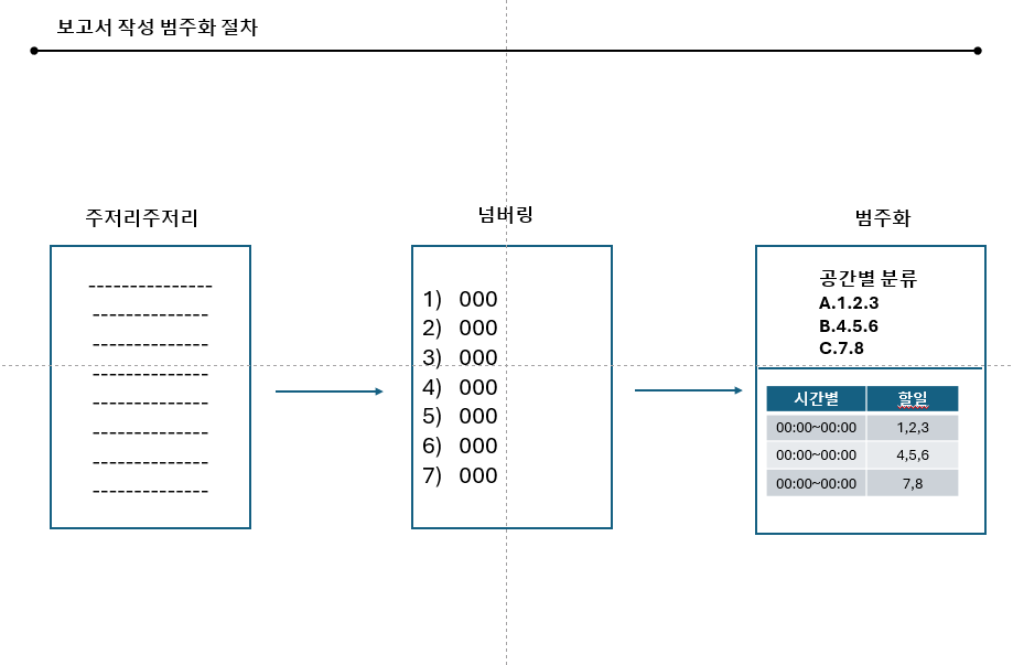 아래에서는 보고서에서 범주화를 활용하는 세부적인 절차, 방법, 과정 등을 단계별로 아주 자세히 설명하겠습니다.