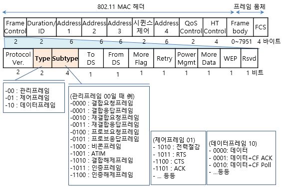 802.11 MAC 프레임 내 802.11 프레임제어필드 중 2,3번째 필드로 프레임 유형 결정