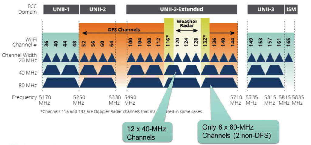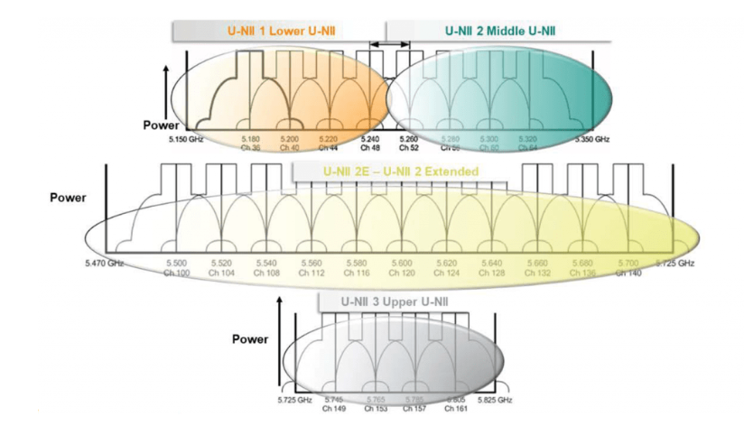 일반적으로 Lower U-NII는 실내용으로, Middle U-NII는 실내 또는 실외용으로, Upper U-NII는 실외용으로만 사용이 가능합니다. 이것은 사용 가능한 U-NII 채널을 8개 가질 수 있음을 의미합니다. 바로 옆에 있는 채널만 서로 간섭할 위험이 있으며, 일반적으로는 채널 간 전력 수준이 충분히 낮아서 간섭이 최소화되거나 전혀 없습니다.