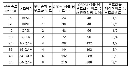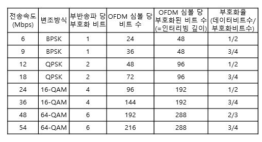 - 8가지 종류의 전송속도 제공 : 6,9,12,18,24,36,48,54 Mbps